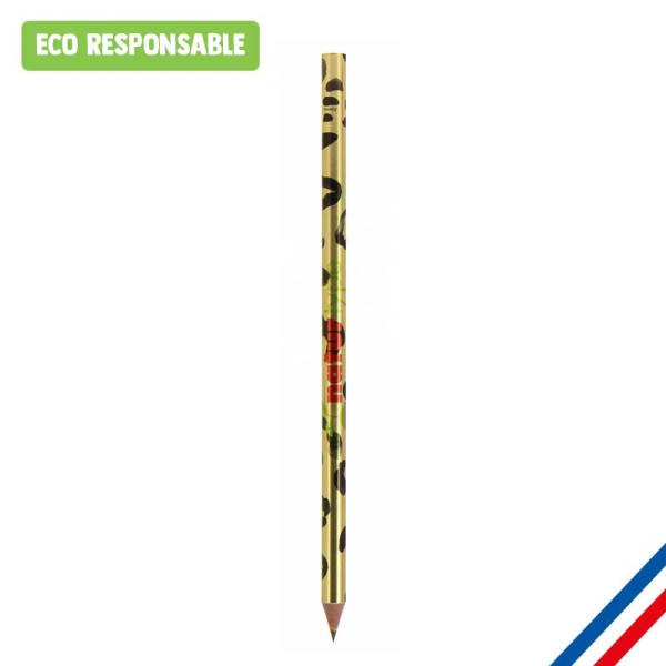 Personnalisez ce crayon à papier publicitaire avec le logo de votre marque sur un fond doré ou argenté, ou bien avec un visuel à 360° avec effet une finition métallique.