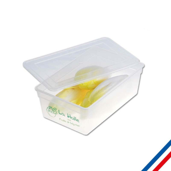 En matière alimentaire transparente, cette boîte publicitaire fabriquée en France (avec capacité de 2 litres) passe au micro-onde et au lave-vaisselle.
