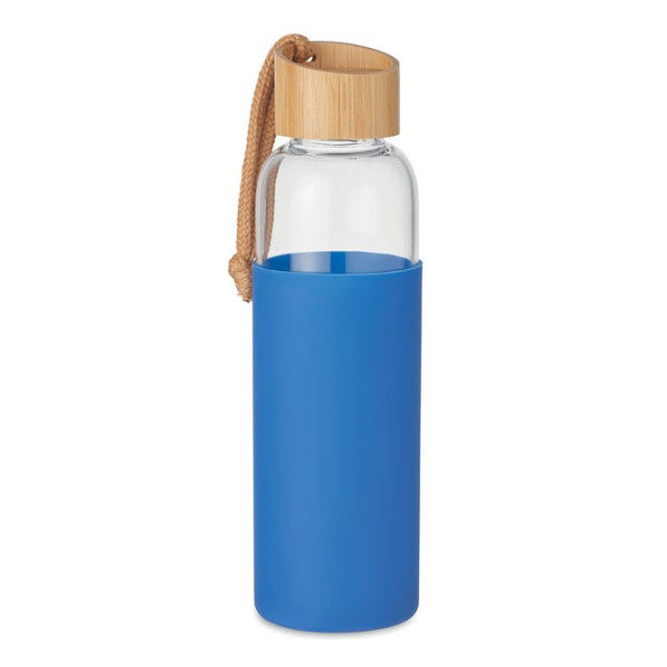 La bouteille en verre 500 ml modèle TULPA allie esthétique et fonctionnalité. Elle est fournie avec une pochette en silicone et un bouchon en bambou doté d'une poignée en coton, idéale pour vos cadeaux d'entreprise et événements.