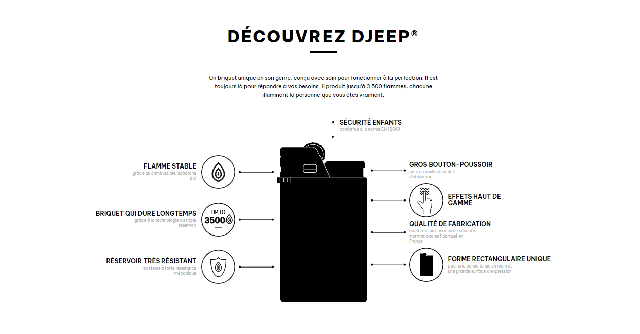 Le briquet DJEEP est personnalisable à votre image à partir de 10000 exemplaires. Ce produit s'adresse donc à des marques ayant un projet ambitieux, avec la volonté de créer un briquet unique, avec des textures spéciales.