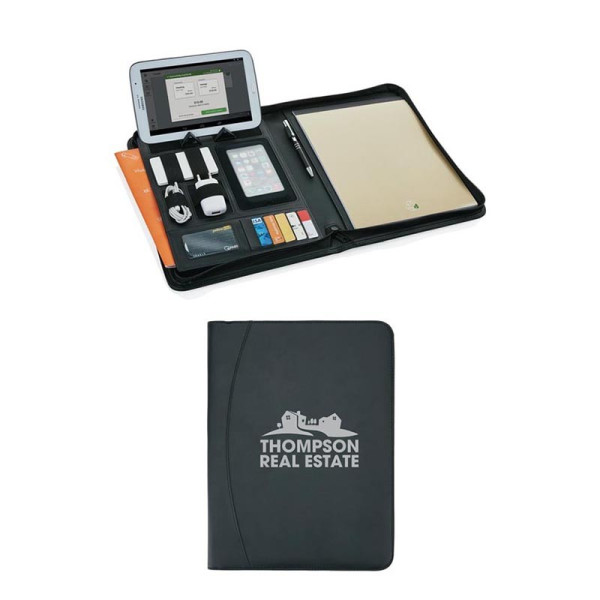 Ce conférencier A4 personnalisé équipé d'une fermeture éclair dispose de tous les compartiments nécessaires pour ranger tout votre matériel de travail : tablette numérique, clé usb, smartphone, batterie portable, chargeur, carte de visite...