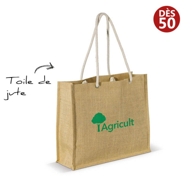 Sac shopping en toile de jute avec anses en corde de coton.