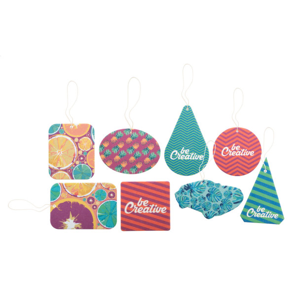 Le produit se décline en formes et senteurs variées : exotique, pomme verte, citron, voiture neuve, océan, vanille, luxe, menthol. L'item peut être adapté à votre identité visuelle grâce à un marquage en quadrichromie.