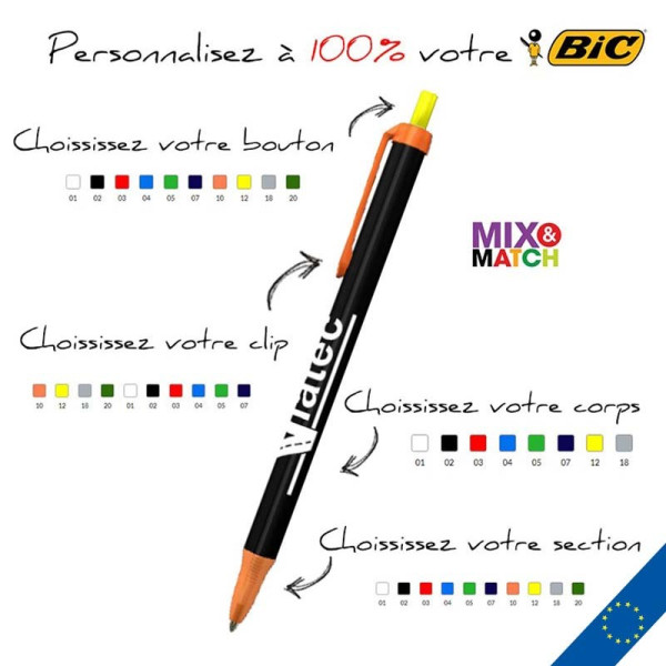 Ce stylo BIC publicitaire est disponible en vert, blanc et turquoise, mais fabriquez votre propre combinaison en choisissant la couleur de chaque partie du stylo avec la fonction Mix&Match, plus de 1000 combinaisons disponibles. Contactez-nous pour personnaliser votre stylo !