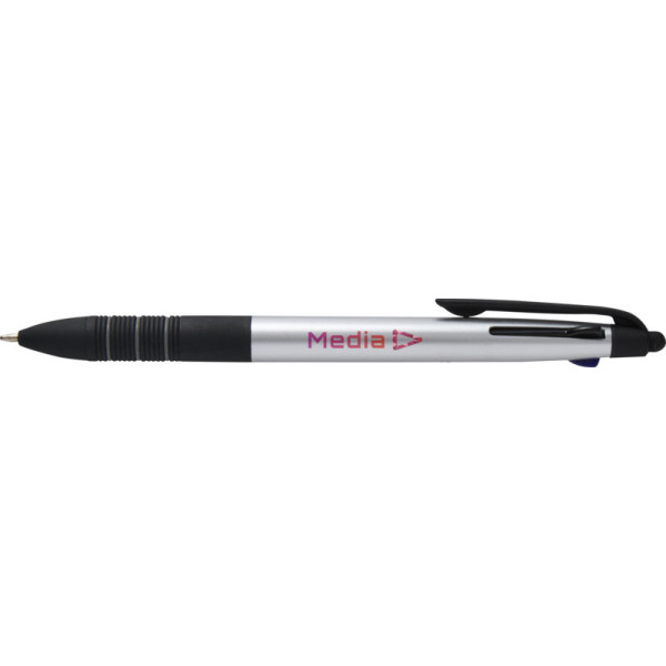 Le stylo STYLUS est un modèle 3-en-1 offrant trois couleurs d'encre (noir, bleu, rouge) et une pointe stylet intégrée pour écrans tactiles. Il est conçu pour la polyvalence et un usage quotidien au bureau ou en déplacement.
