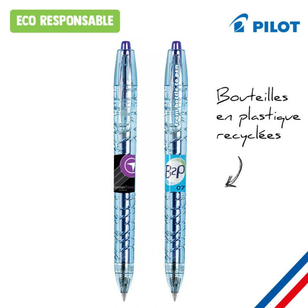 Ce stylo Pilot B2P personnalisable est un roller (encre gel) à la qualité reconnue, personnalisable sur le clip ou en quadri autour du corps sur une étiquette.
